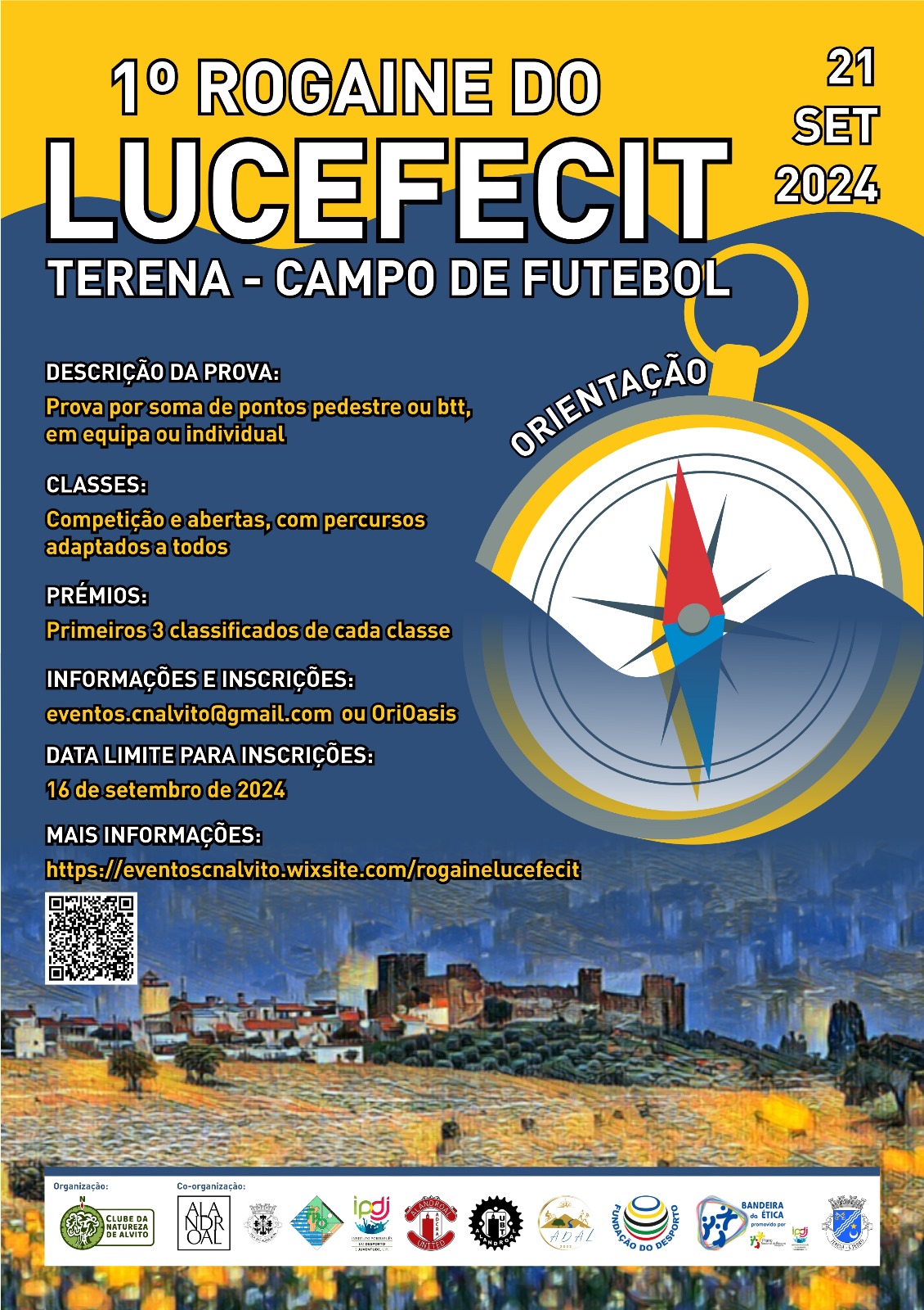 Programa21 de setembro de 2024 – sábado 10h00 - Abertura do Secretariado 11h00 - Briefing pedestre (competição, open e individual absoluto longos) 11h05 - Entrega mapas pedestre 11h20 - Partidas pedestre 11h25 - Briefing BTT (competição, individual absoluto e open longos) 11h30 - Entrega mapas BTT 11h45 - Partidas BTT 11h50 - Briefing pedestre (open e individual absoluto curtos) 11h55 - Entrega mapas pedestre 12h00 - Partidas pedestre 12h05 - Briefing BTT (open e individual absoluto curtos) 12h10 - Entrega mapas BTT 12h25 - Partidas BTT 13h00 - Início das partidas da formação 14h00 - Fim das partidas formação 13h55 - Chegada open e individual absoluto curtos BTT sem penalização 14h00 - Chegada open e individual absoluto curtos pedestre sem penalização 14h25 - Hora limite para chegada open e individual absoluto curtos BTT 14h30 - Hora limite para chegada open e individual absoluto curtos pedestre 14h45 - Chegada competição, open e individual absoluto longos BTT sem penalização 15h15 - Hora limite para chegada BTT 15h20 - Chegada competição, open e individual absoluto longos pedestre sem penalização 15h50 - Hora limite para chegada pedestre 16h30 - Lanche e entrega de prémios |